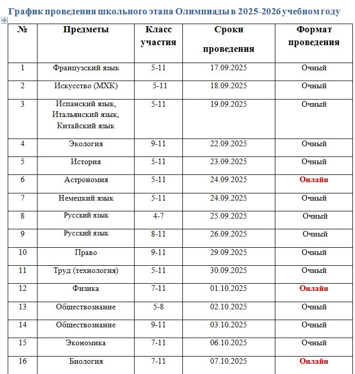 Сроки проведения организационных мероприятий школьного этапа Олимпиады в 2025-2026 учебном году
