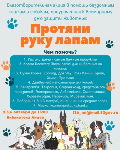 Уважаемые обучающиеся, родители, коллеги! 2-3 и 6 октября Библиотека МАОУ Лицей №36 с 09.00 до 15.00 в преддверии ВСЕМИРНОГО ДНЯ ЗАЩИТЫ ЖИВОТНЫХ(4 октября) мы хотим провести благотворительную акцию «Протяни руку лапам»! Целью этой акции является доброта и милосердие к животным. Мы обращаемся к неравнодушным людям с просьбой пожертвовать для животных приюта любые продукты(крупы), медикоменты, корма как для собак, так и для кошек. Ведь так легко подарить капельку добра нуждающимся! Поможем бездомным животным вместе! Всё собранное будет передано в приют Сострадание-НН! Участие в акции добровольное!