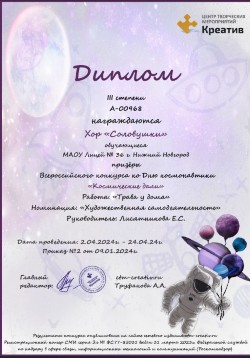 Хоровой коллектив «Соловушки» является одним из ярких творческих кружков нашего Лицея № 36. На протяжении многих лет хор объединяет талантливых учащихся, стремящихся к гармонии и высокому исполнительскому мастерству. Репертуар «Соловушек» охватывает широкий спектр произведений — от классических хоровых шедевров и народной музыки до современных эстрадных аранжировок. Регулярные выступления хора украшают все ключевые мероприятия лицея. «Соловушки» — это не просто занятия музыкой, это командная работа, творчество и результат. Мы гордимся успехами наших певцов!