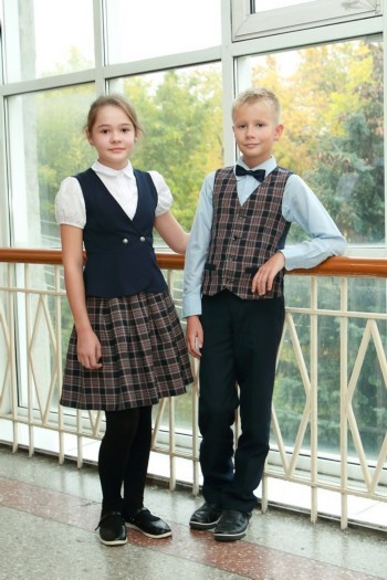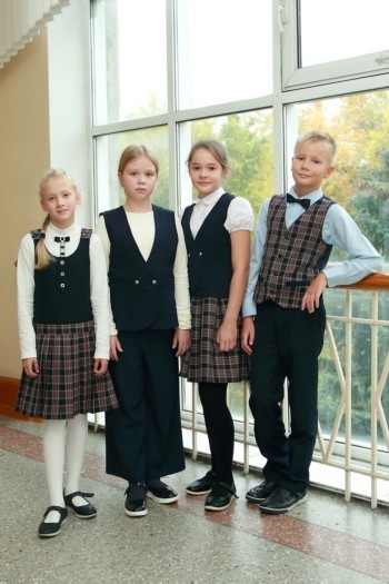 Основной цвет – синий, вставки - в клетку (для девочек сарафан, брюки, жакет «Карина», блузки пастельных тонов, для мальчиков та же цветовая гамма – брюки, жилет, пиджак, рубашки пастельных тонов; для торжественных мероприятий цвет блузки и рубашки - белый, для мальчиков - галстуки спокойных тонов).