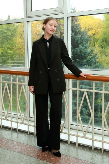 Основной цвет – чёрный в светлую тонкую полоску (для девочек сарафан или юбка, брюки, жакет, «Софи», блузки пастельных тонов, для мальчиков та же цветовая гамма – брюки, жилет, пиджак, рубашки пастельных тонов; для торжественных мероприятий цвет блузки и рубашки - белый).