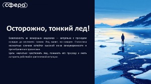Тонкий лёд — это не место для игр! Кажется, что он прочный? На самом деле он таит в себе огромную опасность. Первый лёд обманчив и непредсказуем. Выходить на замёрзший водоём сейчас — значит рисковать жизнью. Даже если лёд выглядит крепким у берега, в центре он может быть очень тонким. Не проверяй прочность льда ударом ноги! Помни: безопасность — это не просто слово. Скажи «нет» опасным прогулкам по льду! Береги себя и возвращайся домой только по безопасным маршрутам.